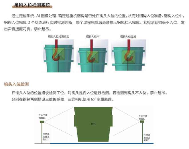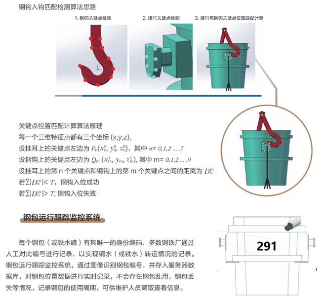 近年來,冶金行業智能化、自動化、云時代等大數據廣泛應用,煉鋼車間是冶金行業的重點區域,廠區設備復雜、環境差、安全隱患多等因素更需要進行設備自動化、智能化的升級管理、實現廠區無人化智慧工廠目標的發展。起重機作為煉鋼、煉鐵、軋鋼車間的主要設備,起重機工作中對在工位操作越來越精準,需要駕駛員及時準確觀察工位狀態,由于駕駛室的位置和現場的工況環境影響經常引起操作失誤,鋼包起吊安全事故頻發,特別是對于鋼包掛鉤是否完整嵌入掛耳,是否進入正確的起吊姿態沒有直接的判斷和監控。研發起重機鋼包定位掛鉤識別管理系統是安全生產的剛性需求。